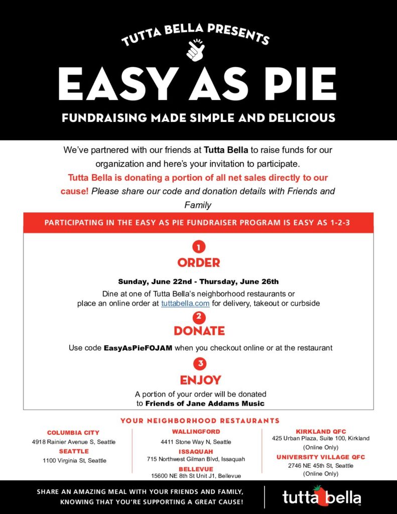 Show your support for FOJAM from Sunday, June 22nd through Thursday, June 26th by ordering pizza from Tutta Bella locations throughout the Seattle area. A portion of your bill will benefit music programs at Jane Addams. Order in person or online using the code EasyAsPieFOJAM. Invite your friends and family and enjoy a delicious meal while supporting a great cause!